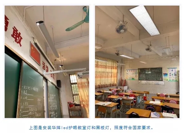 華輝教育照明設計了專門用于教室照明燈具——led護眼教室燈和led護眼黑板燈,符合國家標準課桌維持平均(恒)照度大于300lx,照度均勻度0.7;黑板維持平均(恒)照度500lx,照度均勻度0.8;顯色指數大于90,色彩還原性高;采用格柵防眩光設計,眩光值小于16,不刺眼;色溫是5000K,舒適柔和;整個教室照度均勻,無頻閃,沒有藍光危害。