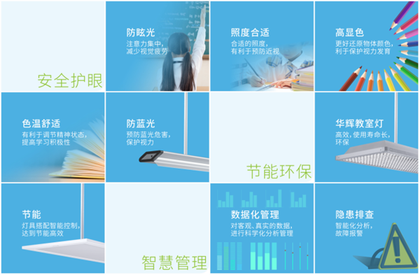 使用華輝led護眼教室燈和led護眼黑板燈,可搭配華輝教育照明AIoT智慧教育照明整體解決方案,通過自主研發的智能照明產品搭載自主研發的智能盒子(如智能配電箱或智能空開),使用智能全觸屏場景開關、遙控器或手機APP輕松切換符合教學所需的照明模式,實現全教室恒照度、一鍵場景控制、窗簾聯動、紫外線殺菌等智能化需求!