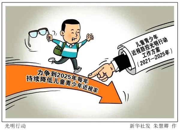 2021年5月份,教育部辦公廳等15部門聯合印發《兒童青少年近視防控光明行動工作方案(2021—2025年)》明確了近視防控光明行動工作目標。通過合力開展兒童青少年近視防控光明行動,努力克服新冠肺炎疫情影響,健全完善兒童青少年近視防控體系,力爭到2025年每年持續降低兒童青少年近視率,有效提升兒童青少年視力健康水平,如期實現《綜合防控兒童青少年近視實施方案》2030年各項目標任務。