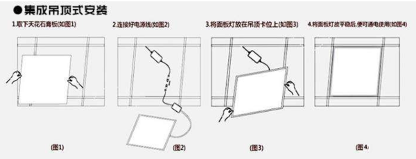 更換流程:首先關(guān)閉總電源,將壞的LED平板燈取下來(lái),然后再將新的LED平板燈電源線接上,做好絕緣防護(hù),最后安裝上去就行。安裝方法如下圖: