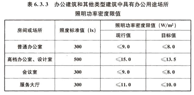 圖:辦公建筑和其他類型建筑中具有辦公用途場所照明功率密度限值表。