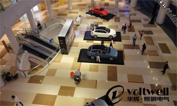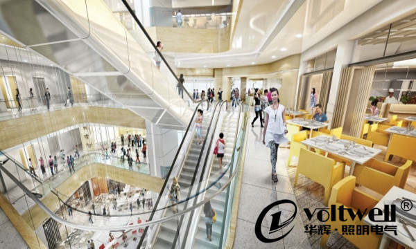 中庭是商場的緩沖區(qū)域和公眾活動空間,并增加商場的開闊感,調節(jié)空氣質量,提升整個商場的空間質量和層次。因此中庭照明設計應具有一定的藝術性,裝飾空間并營造舒適的環(huán)境。
