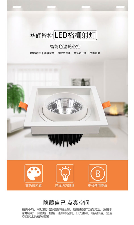 射燈的應(yīng)用效果射燈主要有石英射燈、格柵射燈、座式射燈這三種。其中,石英射燈由燈架、變壓器、燈杯三部分組成。格柵射燈有嵌入式、明裝式、吊袋式等幾種,燈座形式以單頭和雙頭的較多。格柵射燈一般裝在電視墻和過道,客廳全吊頂?shù)臅r候也會采用。座式射燈用得不是很多,一般是在客廳沒有吊頂?shù)那闆r下放在電視墻上面,放裝飾畫的地方也可以采用,其安裝方式分為軌道和座式兩種。