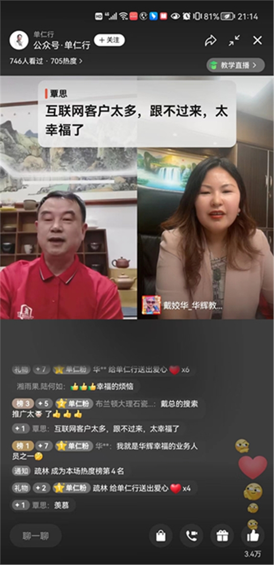 2022年4月16日20:00到22:00,單仁資訊特邀歷屆全國十大牛商對話數(shù)字話營銷大賽20強(qiáng)牛商,實(shí)現(xiàn)企業(yè)家間的面對面干貨分享。此次對話的是全國牛商總匯執(zhí)行會(huì)長陳飛會(huì)長與華輝教育照明總經(jīng)理戴姣華女士,兩位湖南湘潭人在直播間探討全網(wǎng)營銷。
