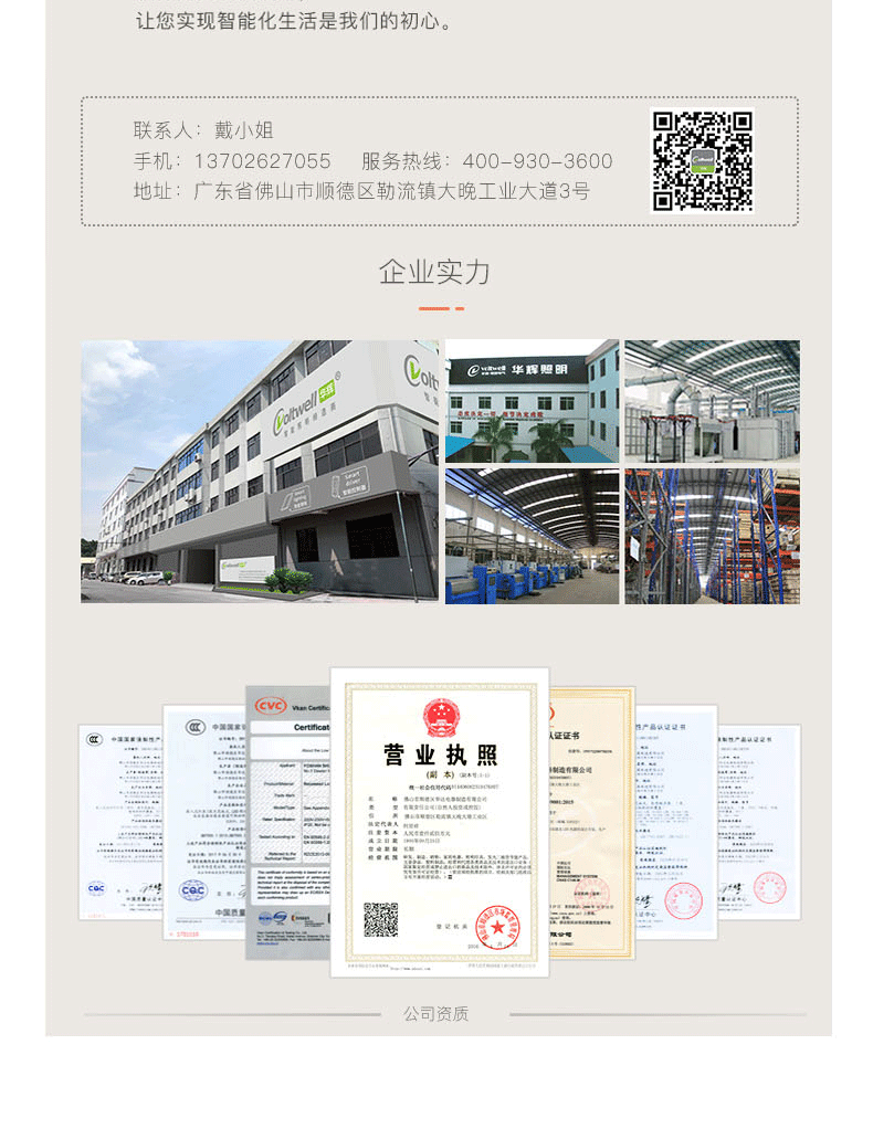 ◆30年專注于研發生產照明電氣產品,滿足您任何場所照明需求。 ◆華達占地10多萬平方米,年生產能力達上千萬套燈具。公司擁有高素質的技術人員100多人,擁有十幾條生產線,各種現代化的生產設備和檢測設備。 ◆擁有ISO9001國際質量體系認證,“中國節能認證”、“CCC”、“CE”、“UL”、“VDE”等國內外權威認證并先后榮獲“出口產品質量許可證”、“消費者信得過產品”等稱號。 |