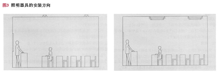 使用照明器具時(shí),為了減少耀眼程度,照明器具必須與黑板成垂直配置。(見圖3(b))