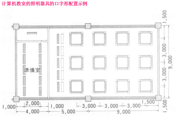 圖13所示為計(jì)算機(jī)教室中照明器具按口字形配置的示例。